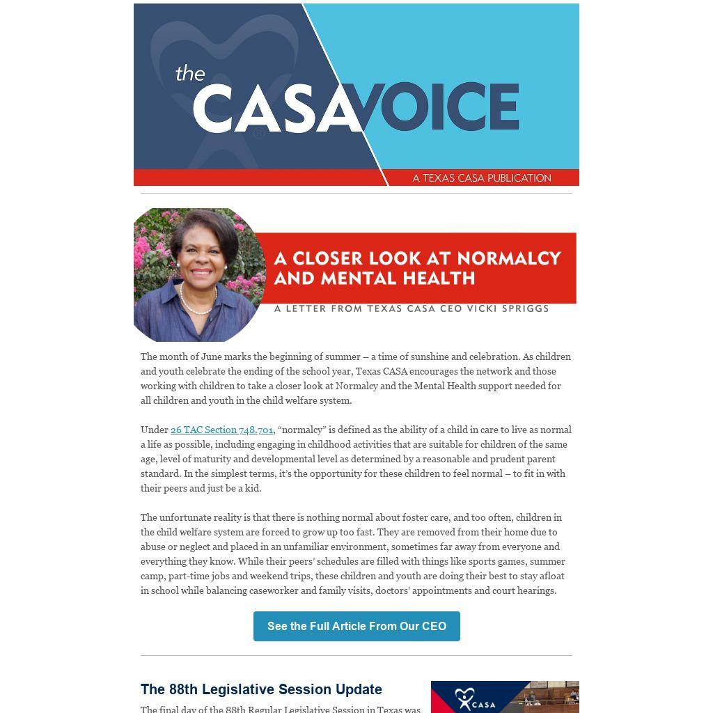 The month of June marks the beginning of summer – a time of sunshine and celebration. As children and youth celebrate the ending of the school year, Texas CASA encourages the network and those working with children to take a closer look at Normalcy and the Mental Health support needed for all children and youth in the child welfare system.