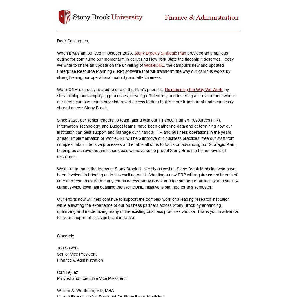 When it was announced in October 2023, Stony Brook’s Strategic Plan provided an ambitious outline for continuing our momentum in delivering New York State the flagship it deserves. Today we write to share an update on the unveiling of WolfieONE, the campus’s new and updated Enterprise Resource Planning (ERP) software that will transform the way our campus works by strengthening our operational maturity and effectiveness.