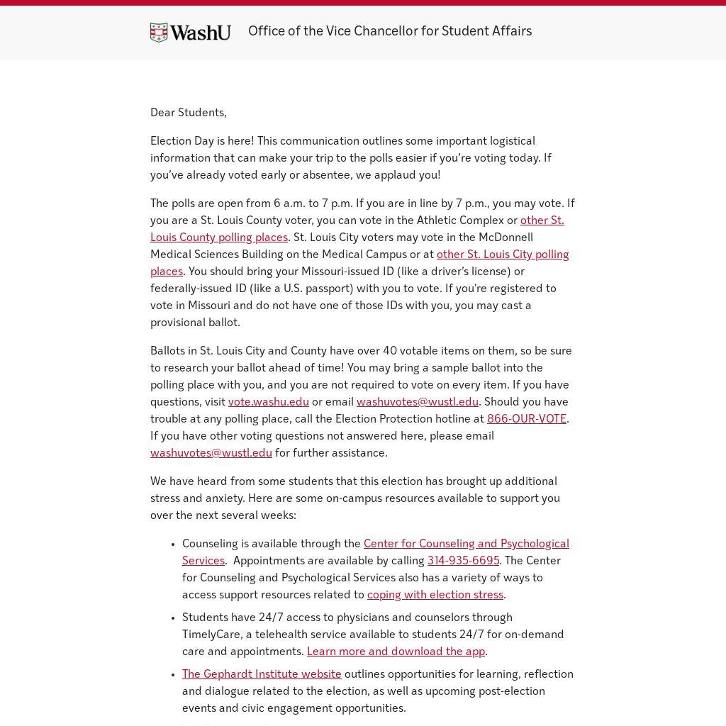 It is my hope and expectation that we will continue to uphold each other’s dignity, foster a community based on mutual respect and free from acts of hate or discrimination toward others. I know we will represent the very best of our WashU community as we head to the polls today, as well as in the weeks ahead, whatever the outcome of the election may be.