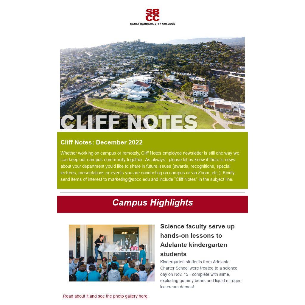 Whether working on campus or remotely, Cliff Notes employee newsletter is still one way we can keep our campus community together. As always, please let us know if there is news about your department you'd like to share in future issues (awards, recognitions, special lectures, presentations or events you are conducting on campus or via Zoom, etc.). Kindly send items of interest to marketing@sbcc.edu and include “Cliff Notes” in the subject line.