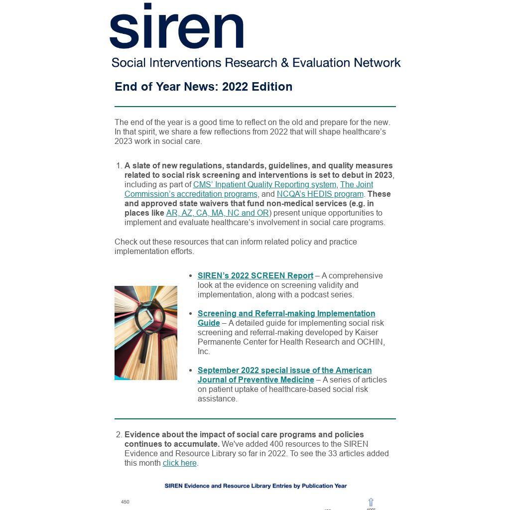 Evidence about the impact of social care programs and policies continues to accumulate. We've added 400 resources to the SIREN Evidence and Resource Library so far in 2022. To see the 33 articles added this month click here.