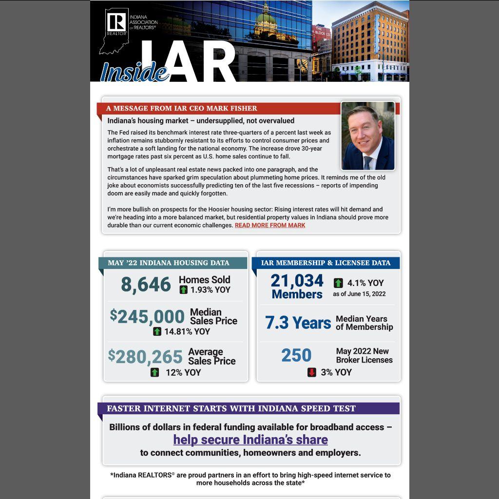 Inside IAR. This monthly newsletter is an activity report from your state association. It’s for our leaders (board members, committee members, past presidents) and the leaders (presidents, presidents-elect) and staff at our local associations. We want to empower you with information and open the lines of communication. The goal is to form more partnerships so the REALTOR® organization is the strongest it can be in Indiana. Thank you for reading and thank you for the time and talent you give to the real estate industry.