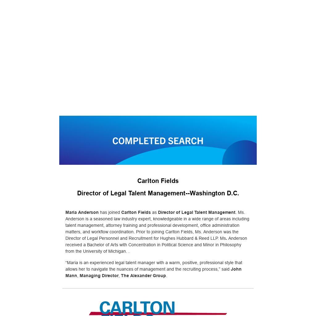 Maria Anderson has joined Carlton Fields as Director of Legal Talent Management. Ms. Anderson is a seasoned law industry expert, knowledgeable in a wide range of areas including talent management, attorney training and professional development, office administration matters, and workflow coordination. Prior to joining Carlton Fields, Ms. Anderson was the Director of Legal Personnel and Recruitment for Hughes Hubbard & Reed LLP. Ms. Anderson received a Bachelor of Arts with Concentration in Political Science and Minor in Philosophy from the University of Michigan. .