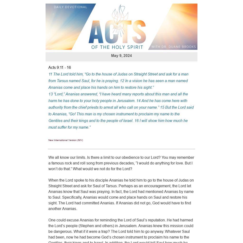 When the Lord spoke to his disciple Ananias he told him to go to the house of Judas on Straight Street and ask for Saul of Tarsus. Perhaps as an encouragement, the Lord let Ananias know that Saul was praying. In fact, the Lord had mentioned Ananias by name to Saul. Specifically, Ananias would come and place hands on Saul and restore his sight. The Lord had committed Ananias. If Ananias did not go, God would have to find another Ananias.