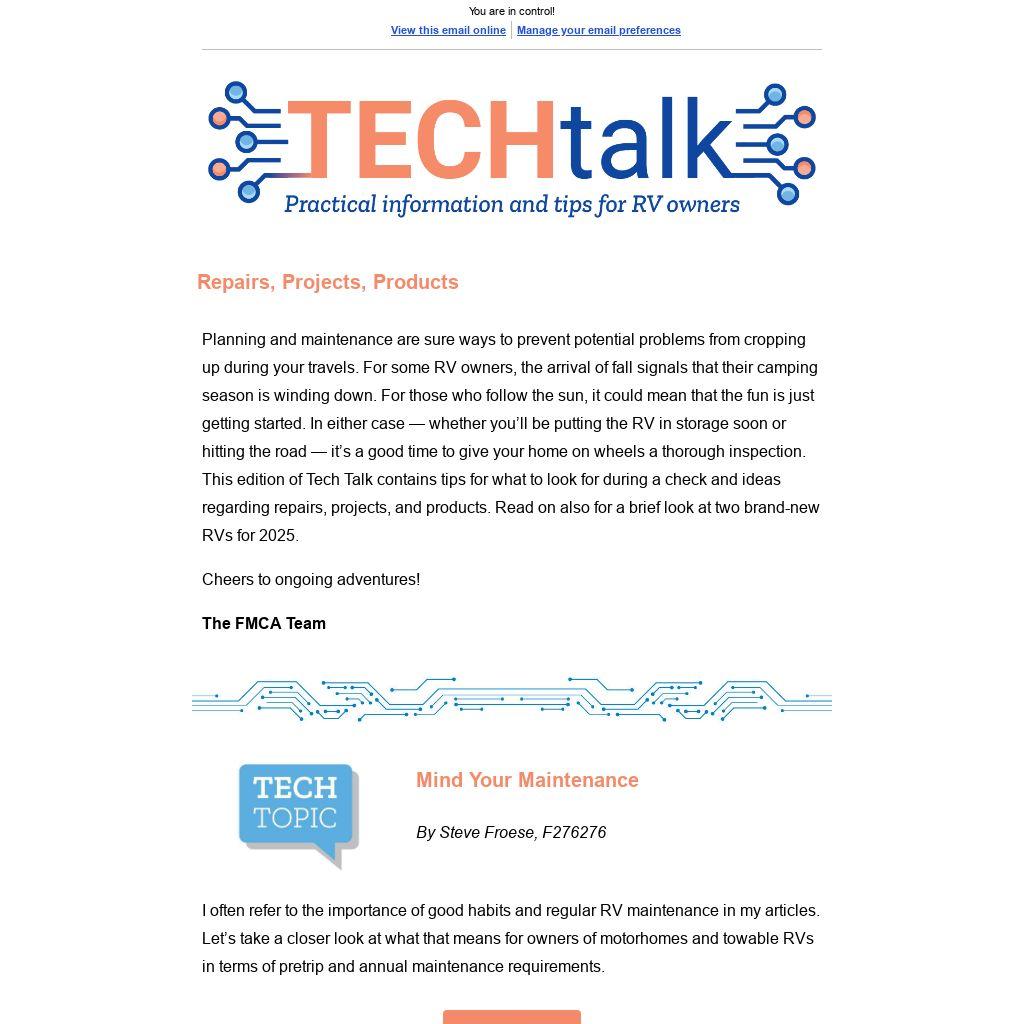 Planning and maintenance are sure ways to prevent potential problems from cropping up during your travels. For some RV owners, the arrival of fall signals that their camping season is winding down. For those who follow the sun, it could mean that the fun is just getting started. In either case — whether you’ll be putting the RV in storage soon or hitting the road — it’s a good time to give your home on wheels a thorough inspection. This edition of Tech Talk contains tips for what to look for during a check and ideas regarding repairs, projects, and products. Read on also for a brief look at two brand-new RVs for 2025.