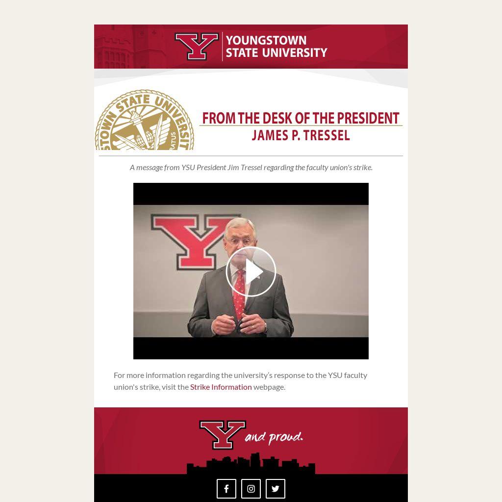 A message from YSU President Jim Tressel regarding the faculty union's strike.