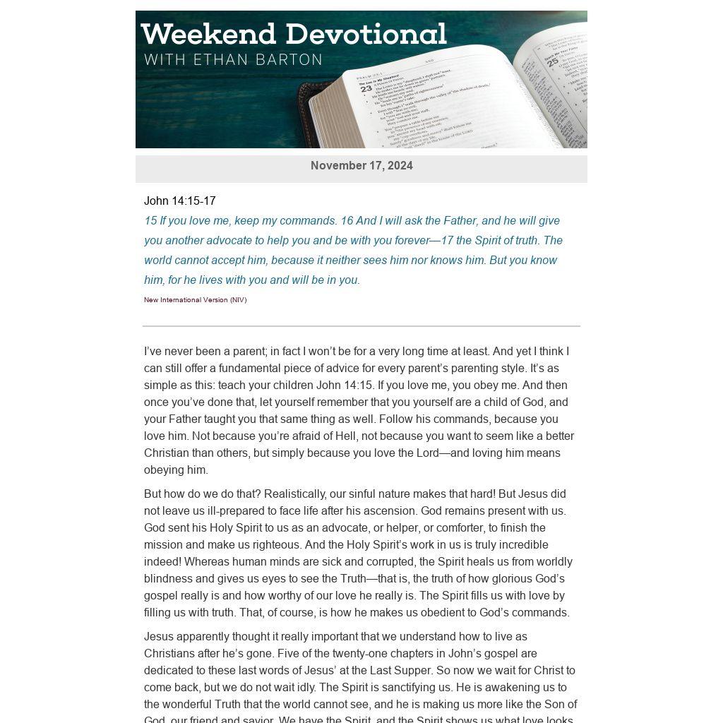 I’ve never been a parent; in fact I won’t be for a very long time at least. And yet I think I can still offer a fundamental piece of advice for every parent’s parenting style. It’s as simple as this: teach your children John 14:15. If you love me, you obey me. And then once you’ve done that, let yourself remember that you yourself are a child of God, and your Father taught you that same thing as well. Follow his commands, because you love him. Not because you’re afraid of Hell, not because you want to seem like a better Christian than others, but simply because you love the Lord—and loving him means obeying him.
