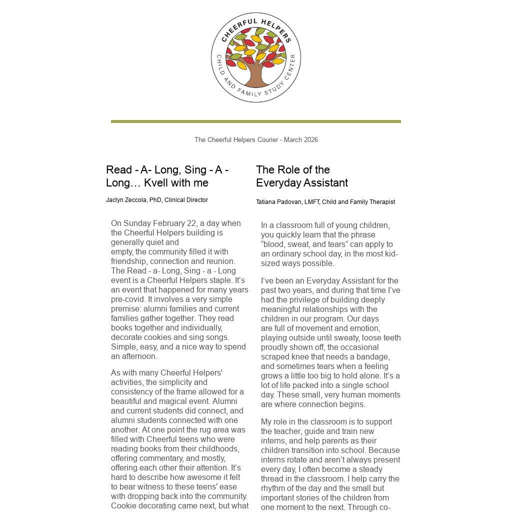 empty, the community filled it with friendship, connection and reunion. The Read - a- Long, Sing - a - Long event is a Cheerful Helpers staple. It’s an event that happened for many years