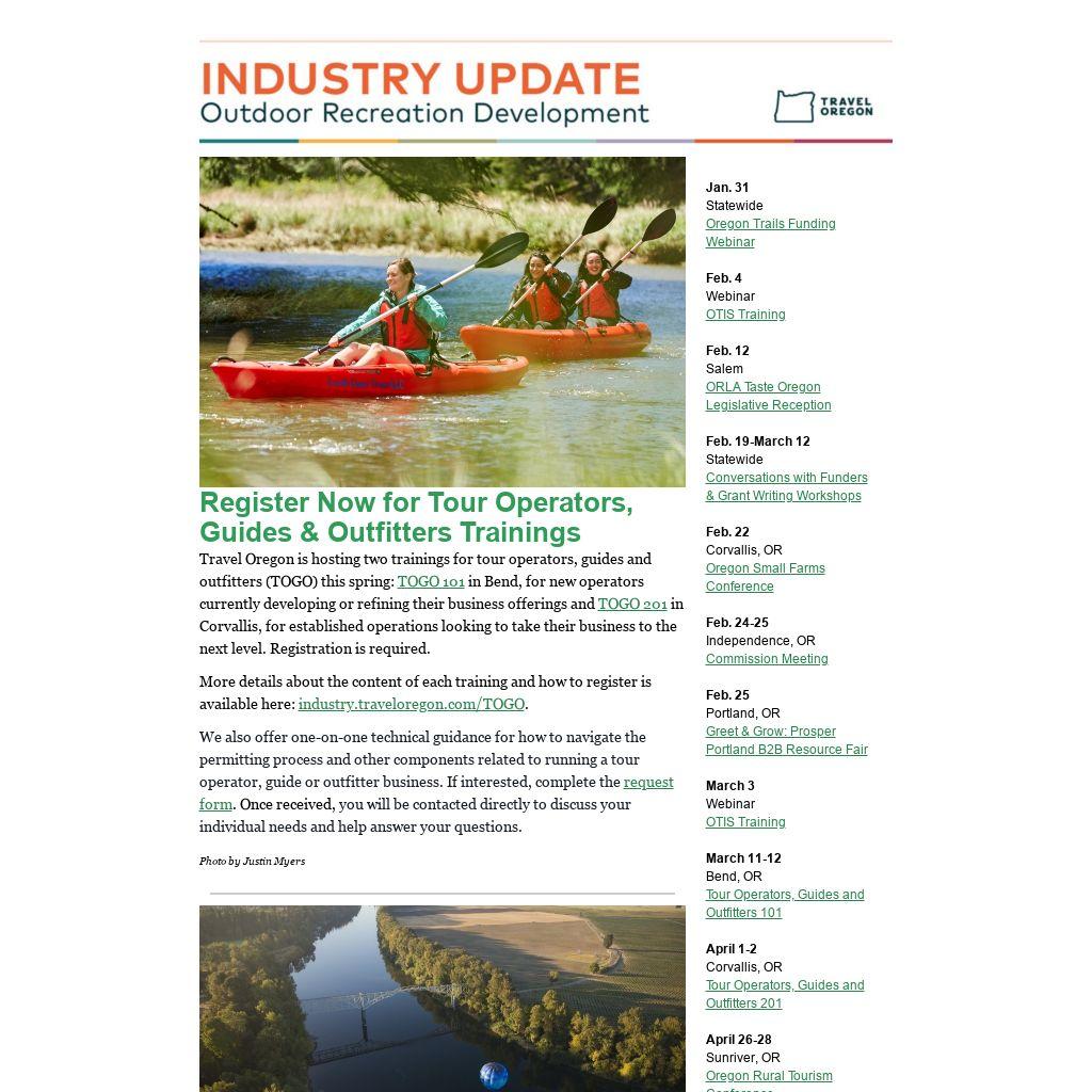 Travel Oregon, in partnership with the Willamette Valley Visitors Association and a local steering committee, will offer a workshop series this spring in the Willamette River area between Springfield and Milwaukie. This River Recreation Studio program is designed to help identify actionable opportunities and develop priority strategies to enhance the river recreation experience in a manageable and sustainable way.