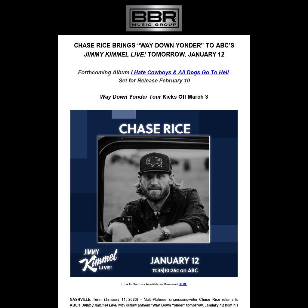 NASHVILLE, Tenn. (January 11, 2023) – Multi-Platinum singer/songwriter Chase Rice returns to ABC’s Jimmy Kimmel Live! with outlaw anthem “Way Down Yonder” tomorrow, January 12 from his forthcoming album I Hate Cowboys & All Dogs Go To Hell, set for release February 10. Jimmy Kimmel Live! airs at 11:35/10:35pm CT on ABC.