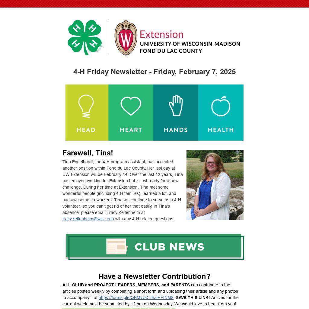 | Farewell, Tina!Tina Engelhardt, the 4-H program assistant, has accepted another position within Fond du Lac County. Her last day at UW-Extension will be February 14. Over the last 12 years, Tina has enjoyed working for Extension but is just ready for a new challenge. During her time at Extension, Tina met some wonderful people (including 4-H families), learned a lot, and had awesome co-workers. Tina will continue to serve as a 4-H volunteer, so you can't get rid of her that easily. In Tina's absence, please email Tracy Keifenheim at tracy.keifenheim@wisc.edu with any 4-H related questions.