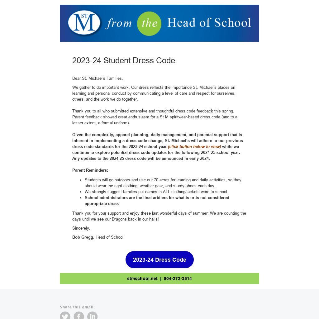 Thank you to all who submitted extensive and thoughtful dress code feedback this spring. Parent feedback showed great enthusiasm for a St M spiritwear-based dress code (and to a lesser extent, a formal uniform).