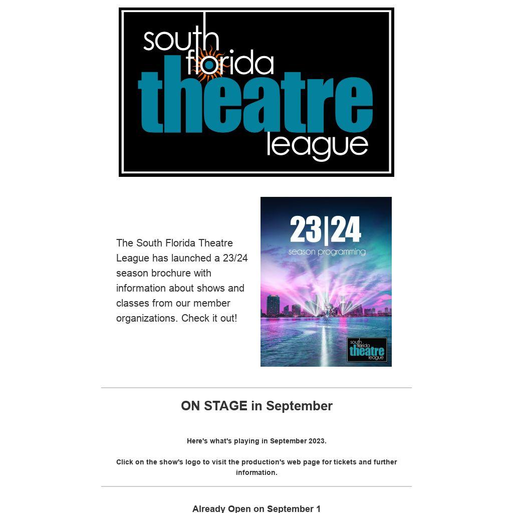 This email blast and other programs of the South Florida Theatre League are made possible with the support of Miami-Dade County Department of Cultural Affairs and the Cultural Affairs Council, the Miami-Dade County Mayor and Board of County Commissioners.