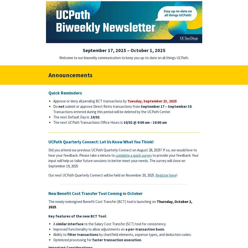 Welcome to our biweekly communication to keep you up-to-date on all things UCPath. |