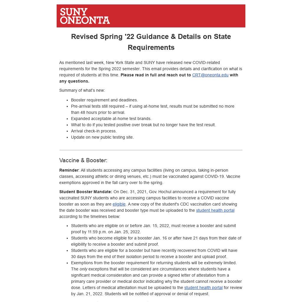 | As mentioned last week, New York State and SUNY have released new COVID-related requirements for the Spring 2022 semester. This email provides details and clarification on what is required of students at this time. Please read in full and reach out to CRT@oneonta.edu with any questions.
