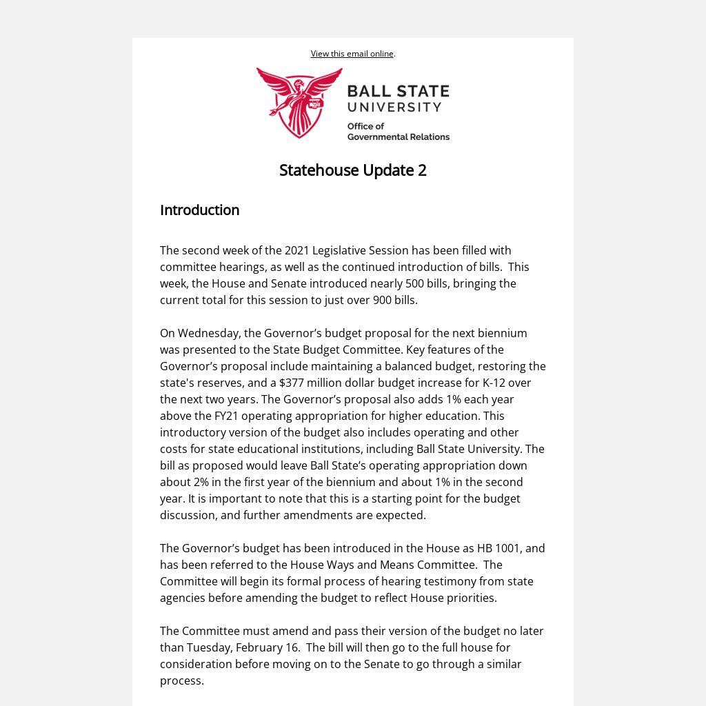 On Wednesday, the Governor’s budget proposal for the next biennium was presented to the State Budget Committee. Key features of the Governor’s proposal include maintaining a balanced budget, restoring the state's reserves, and a $377 million dollar budget increase for K-12 over the next two years. The Governor’s proposal also adds 1% each year above the FY21 operating appropriation for higher education. This introductory version of the budget also includes operating and other costs for state educational institutions, including Ball State University. The bill as proposed would leave Ball State’s operating appropriation down about 2% in the first year of the biennium and about 1% in the second year. It is important to note that this is a starting point for the budget discussion, and further amendments are expected.