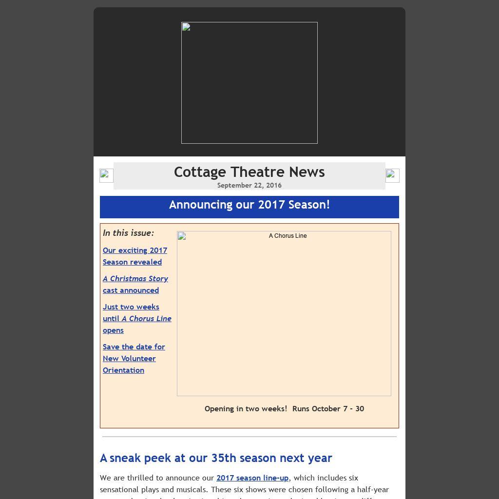 Have you wondered about getting involved behind the scenes at Cottage Theatre? Mark your calendar for a backstage tour and new volunteer orientation on Saturday, November 12 at 10:00 am. This very informal event will give you a chance to find out about helping with sets, lights, sound, props, and costumes for CT shows. (And following the backstage tour, we'll be painting the set for A Christmas Story — so you're welcome to wear your painting clothes and join us! No experience necessary, just a willingness to learn.)