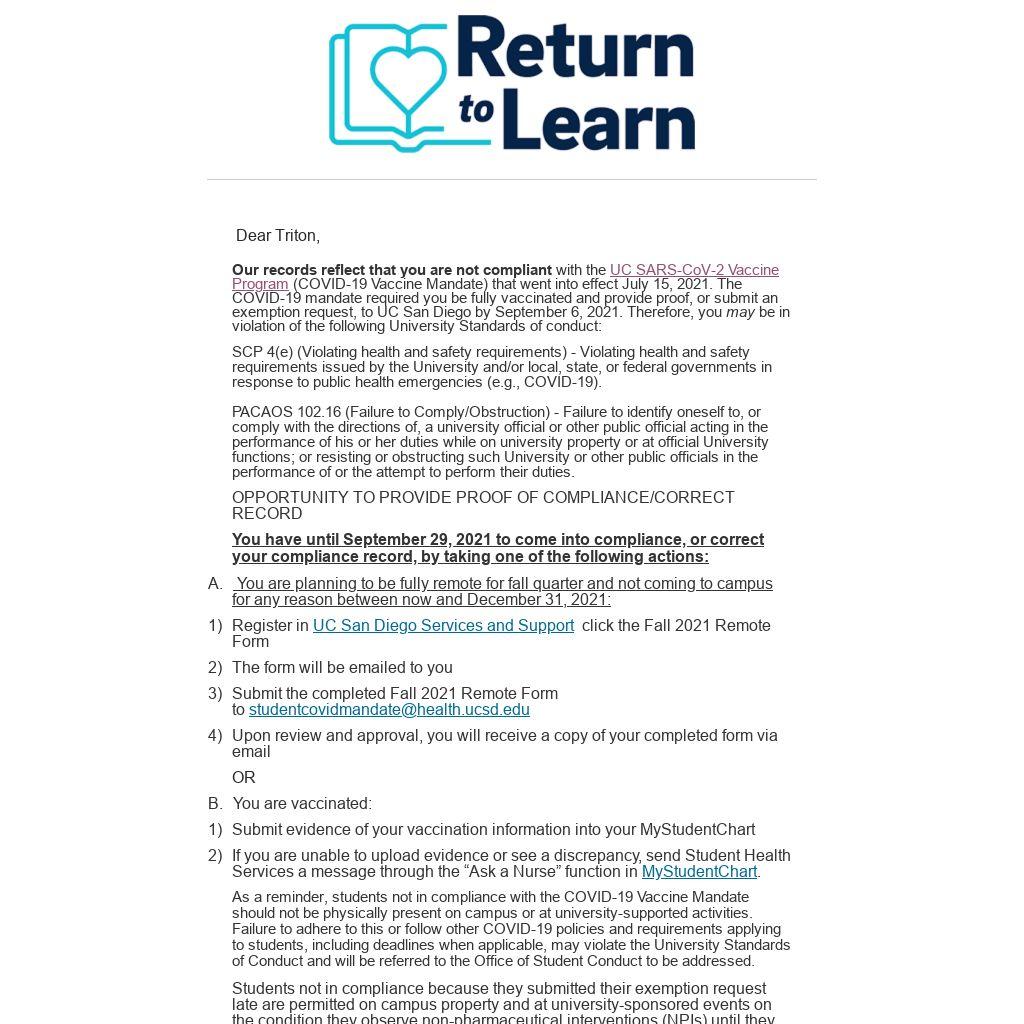 UC SARS-CoV-2 Vaccine Program (COVID-19 Vaccine Mandate) that went into effect July 15, 2021. The COVID-19 mandate required you be fully vaccinated and provide proof, or submit an exemption request, to UC San Diego by September 6, 2021. Therefore, you