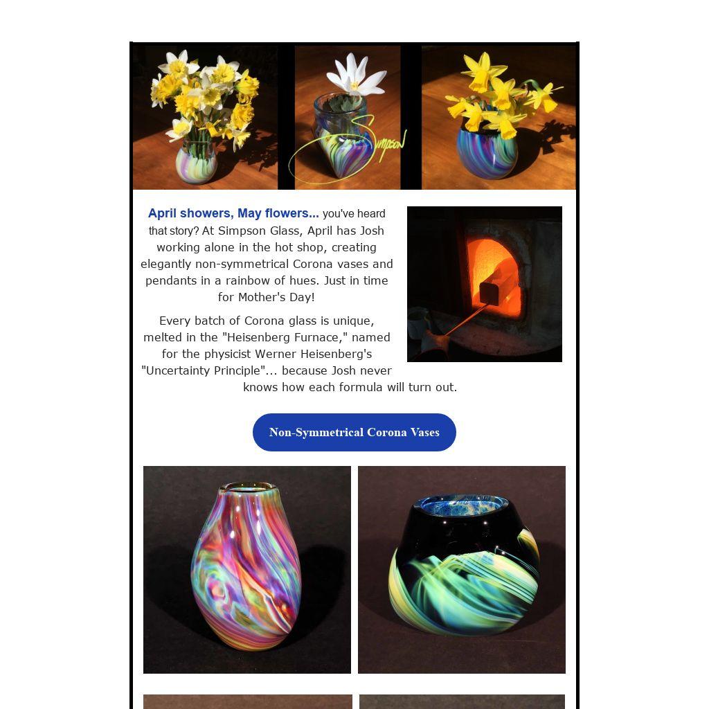 April showers, May flowers... you've heard that story? At Simpson Glass, April has Josh working alone in the hot shop, creating elegantly non-symmetrical Corona vases and pendants in a rainbow of hues. Just in time for Mother's Day!