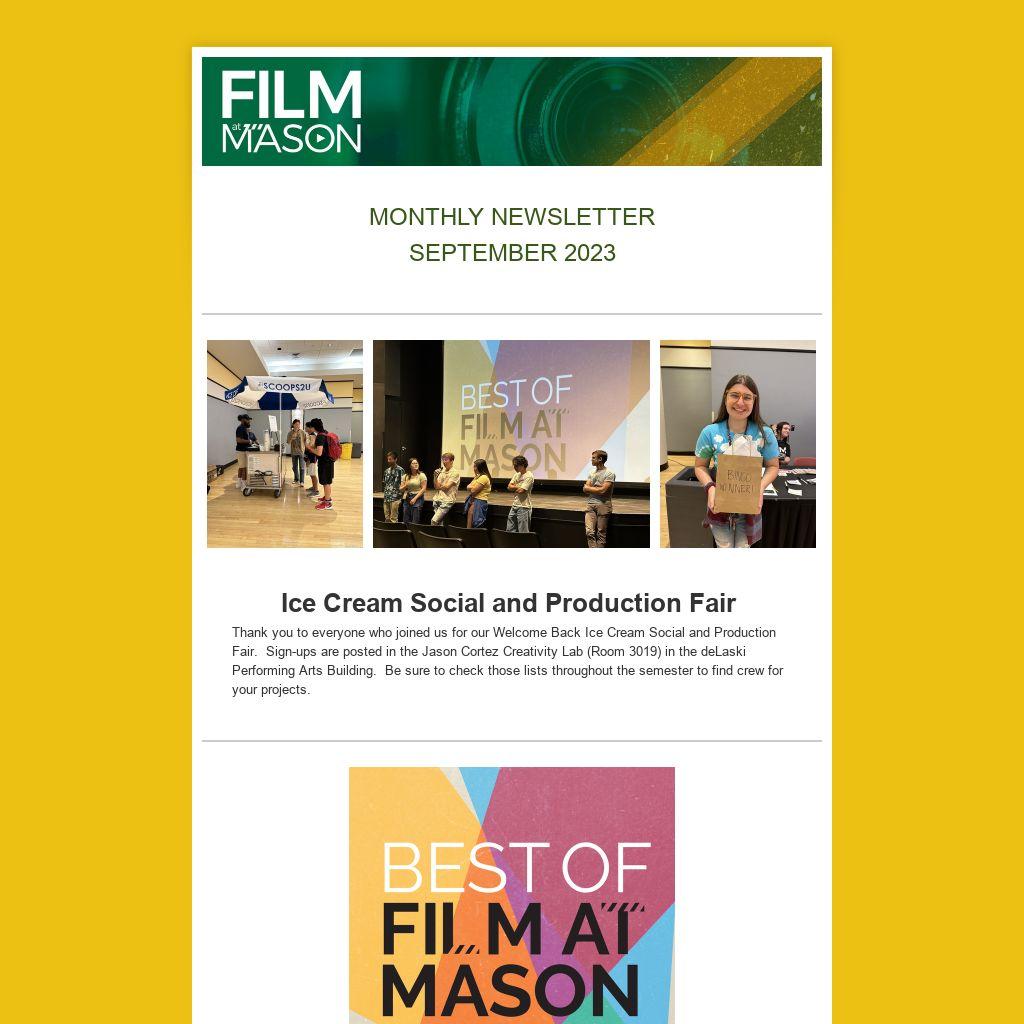 We want to hear from you! If you have news you would like to contribute, please send it to film@gmu.edu. We are looking for regional film events and updates from Film at Mason alumni. Keep up-to-date on all the current Film at Mason news at film.gmu.edu.