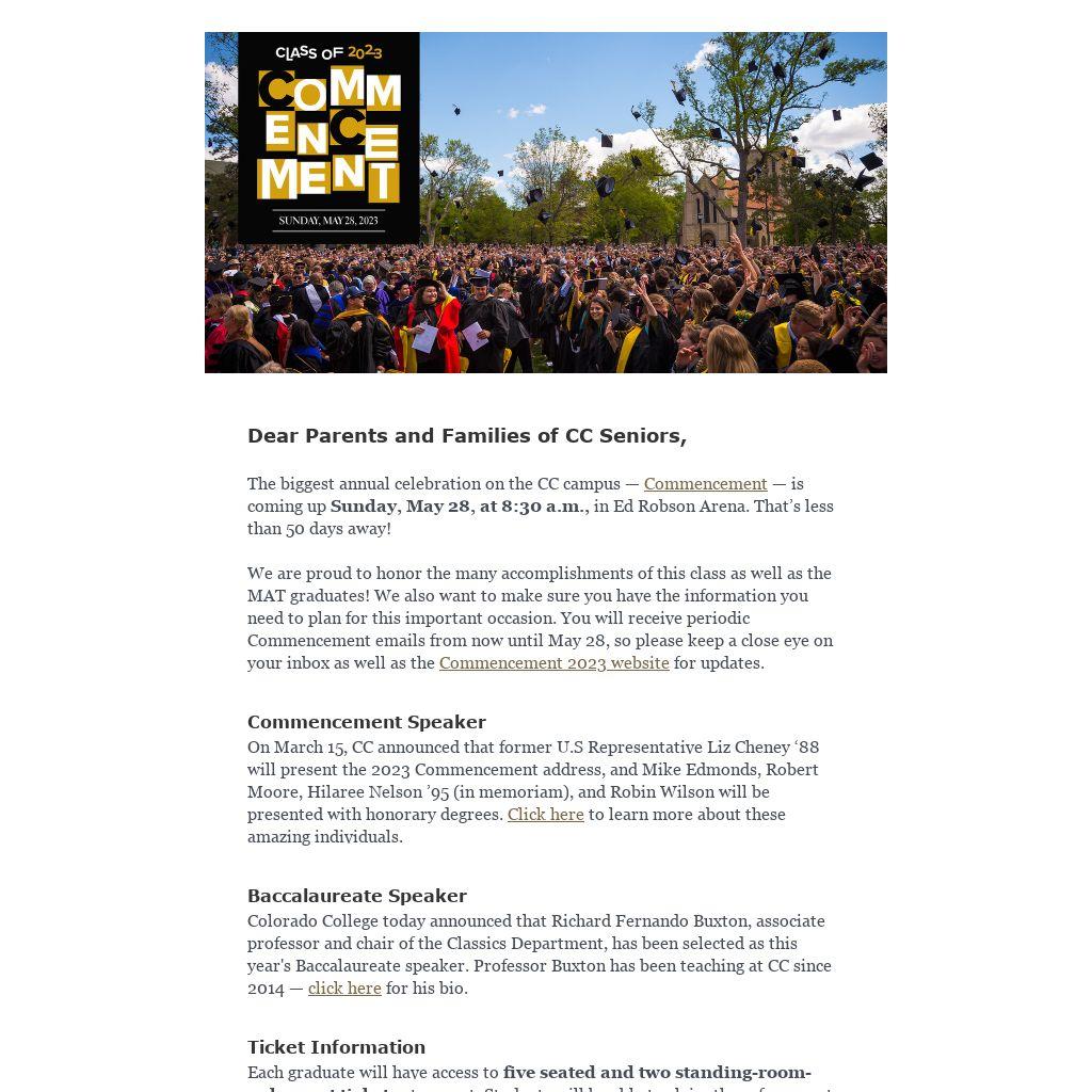 Baccalaureate Blessings are a special part of the graduation tradition for Colorado College students. Parents and families of seniors are invited to share well wishes and words of celebration for their graduates. Together, these messages form a communal blessing, sharing both individual and collective love, blessing, and hope for the graduates as they journey forth from Colorado College. This year, Baccalaureate Blessings are once again happening