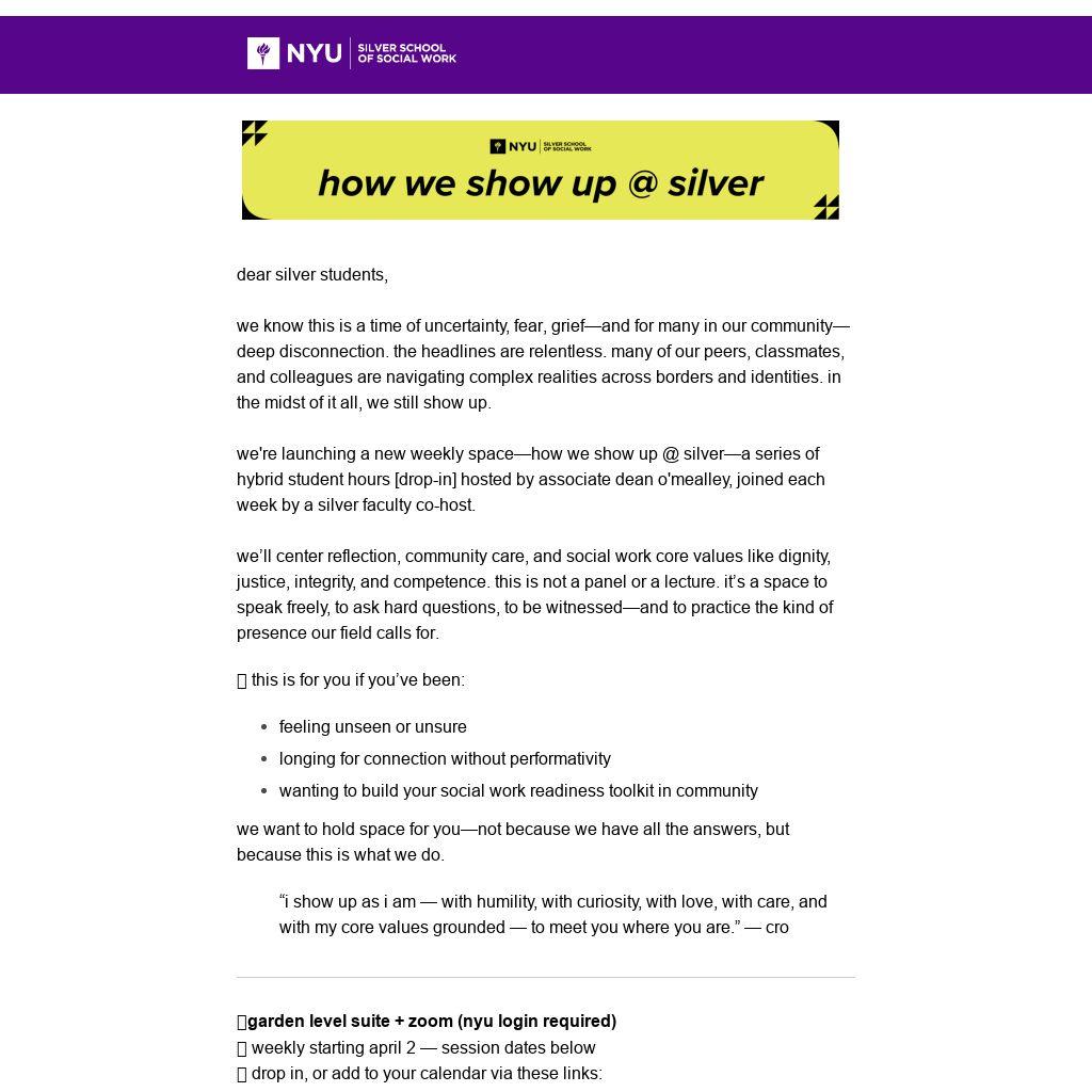 we're launching a new weekly space—how we show up @ silver—a series of hybrid student hours [drop-in] hosted by associate dean o'mealley, joined each week by a silver faculty co-host.