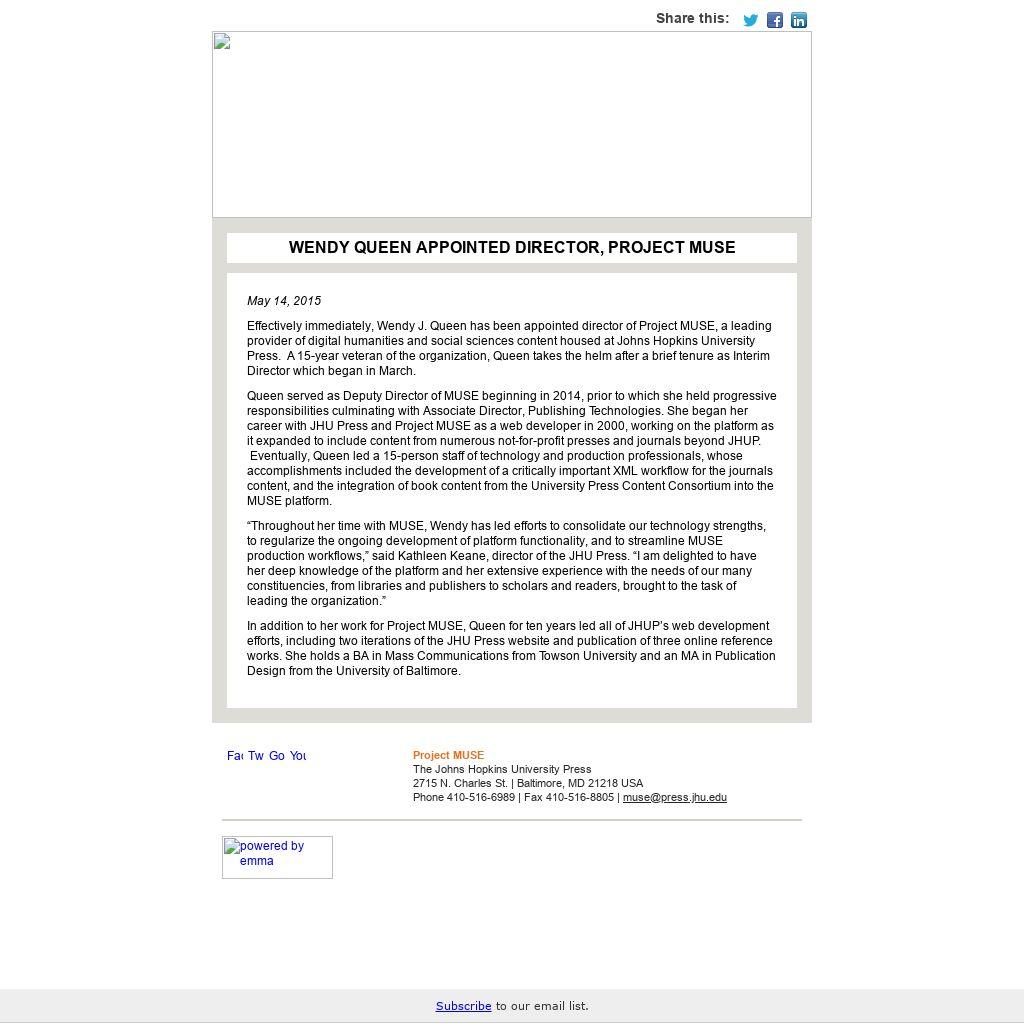 Effectively immediately, Wendy J. Queen has been appointed director of Project MUSE, a leading provider of digital humanities and social sciences content housed at Johns Hopkins University Press. A 15-year veteran of the organization, Queen takes the helm after a brief tenure as Interim Director which began in March.
