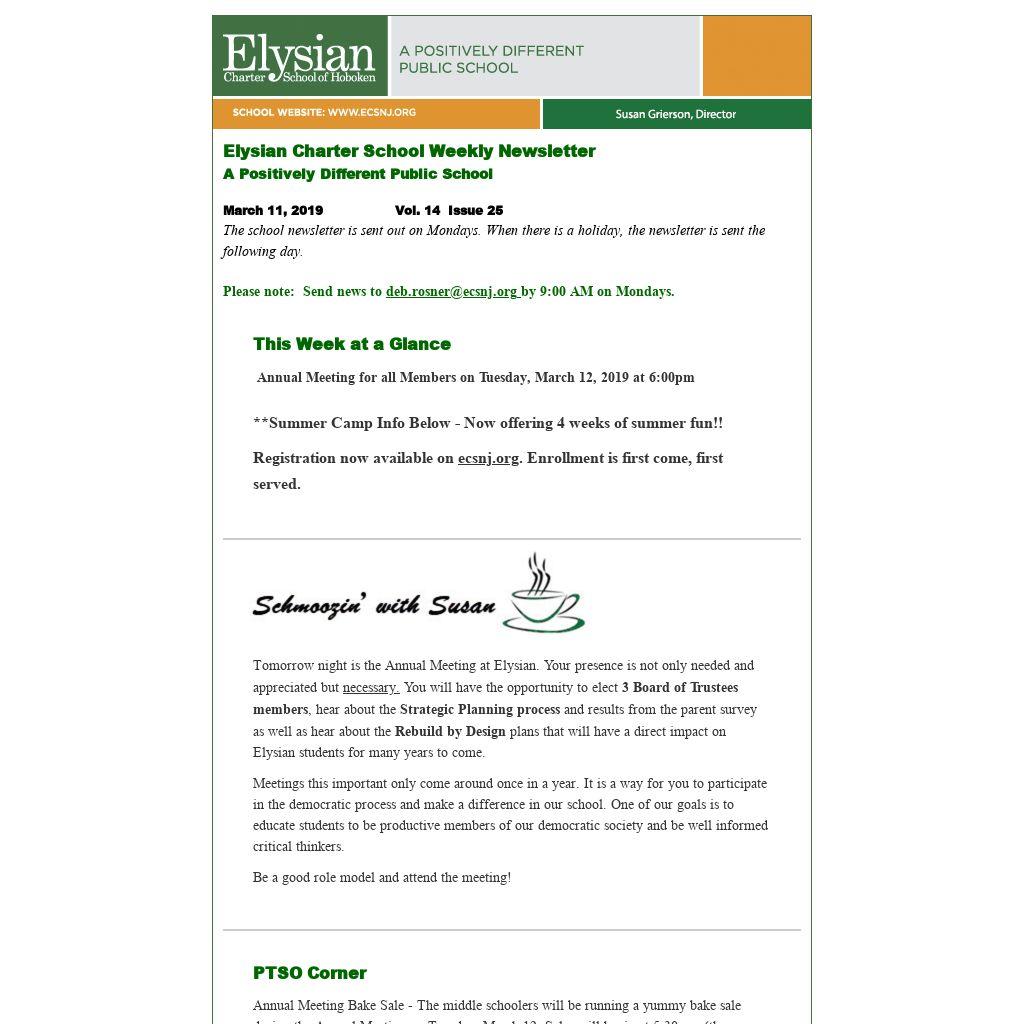 Tomorrow night is the Annual Meeting at Elysian. Your presence is not only needed and appreciated but necessary. You will have the opportunity to elect 3 Board of Trustees members, hear about the Strategic Planning process and results from the parent survey as well as hear about the Rebuild by Design plans that will have a direct impact on Elysian students for many years to come. Meetings this important only come around once in a year. It is a way for you to participate in the democratic process and make a difference in our school. One of our goals is to educate students to be productive members of our democratic society and be well informed critical thinkers. Be a good role model and attend the meeting!