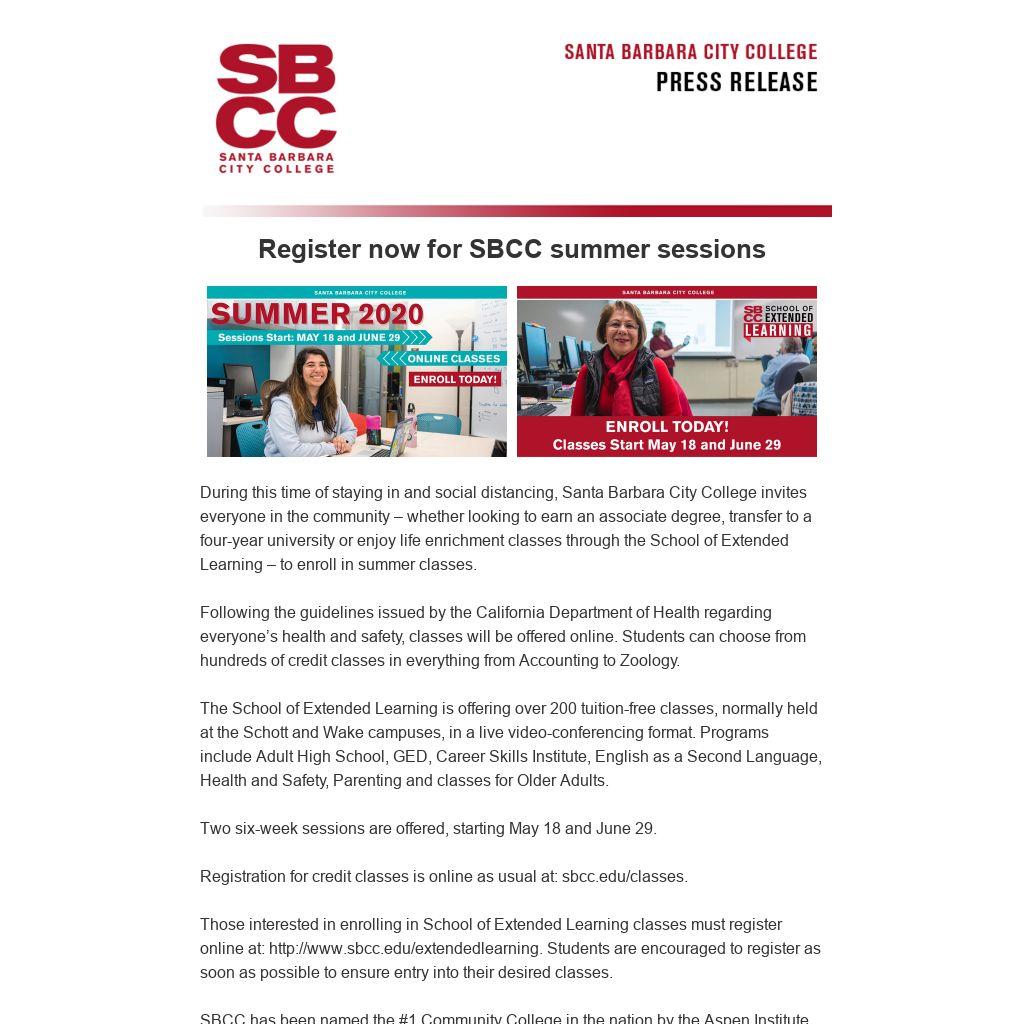 During this time of staying in and social distancing, Santa Barbara City College invites everyone in the community – whether looking to earn an associate degree, transfer to a four-year university or enjoy life enrichment classes through the School of Extended Learning – to enroll in summer classes.