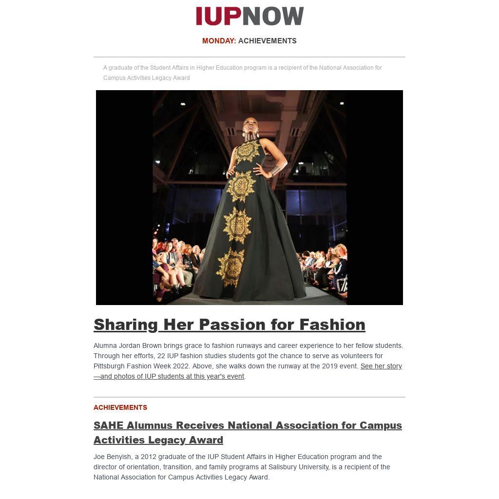 Distributed to IUP employees and students twice a week, IUP Now is the official newsletter of Indiana University of Pennsylvania. It features news from across the IUP website, compiled by the Division of Marketing and Communications. Find out how to get your news and events in IUP Now.
