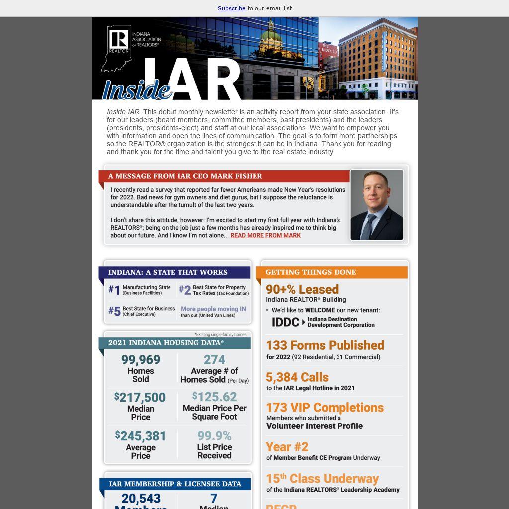Inside IAR. This debut monthly newsletter is an activity report from your state association. It’s for our leaders (board members, committee members, past presidents) and the leaders (presidents, presidents-elect) and staff at our local associations. We want to empower you with information and open the lines of communication. The goal is to form more partnerships so the REALTOR® organization is the strongest it can be in Indiana. Thank you for reading and thank you for the time and talent you give to the real estate industry.