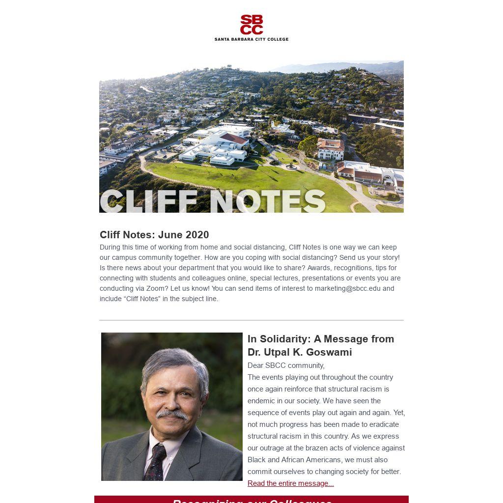 Cliff Notes: June 2020During this time of working from home and social distancing, Cliff Notes is one way we can keep our campus community together. How are you coping with social distancing? Send us your story! Is there news about your department that you would like to share? Awards, recognitions, tips for connecting with students and colleagues online, special lectures, presentations or events you are conducting via Zoom? Let us know! You can send items of interest to marketing@sbcc.edu and include “Cliff Notes” in the subject line.