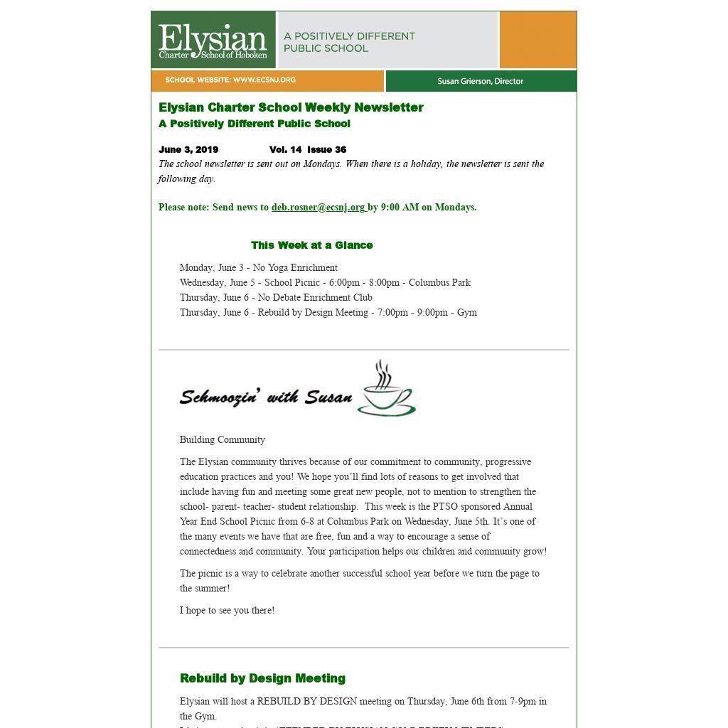 YEAR END PICNIC THIS WEDNESDAY - The Elysian annual picnic is THIS Wednesday, June 5! Every family is asked to bring something to help make this a success (please see flyer below!). It is a potluck, so we ask that you bring food according to the grade(s) of your kid(s): K - 2nd Grade: Entrees – pasta, pizza, sandwiches, chicken, etc. 3rd - 5th Grade: Salads, Sides or Fruit. 6th - 8th Grade: Dessert, Water, Juice Boxes.