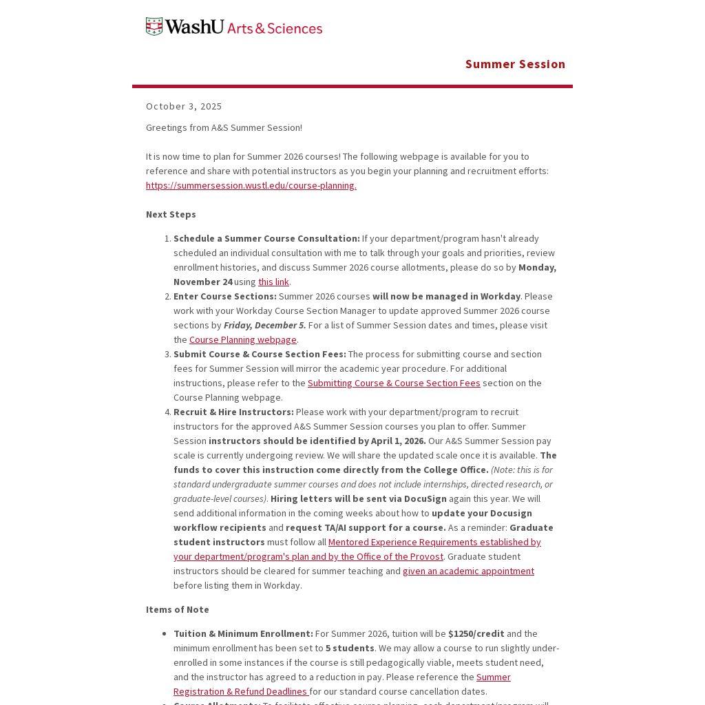 Recruit & Hire Instructors: Please work with your department/program to recruit instructors for the approved A&S Summer Session courses you plan to offer. Summer Session instructors should be identified by April 1, 2026. Our A&S Summer Session pay scale is currently undergoing review. We will share the updated scale once it is available. The funds to cover this instruction come directly from the College Office. (Note: this is for standard undergraduate summer courses and does not include internships, directed research, or graduate-level courses). Hiring letters will be sent via DocuSign again this year. We will send additional information in the coming weeks about how to update your Docusign workflow recipients and request TA/AI support for a course. As a reminder: Graduate student instructors must follow all Mentored Experience Requirements established by your department/program's plan and by the Office of the Provost. Graduate student instructors should be cleared for summer teaching and given an academic appointment before listing them in Workday.