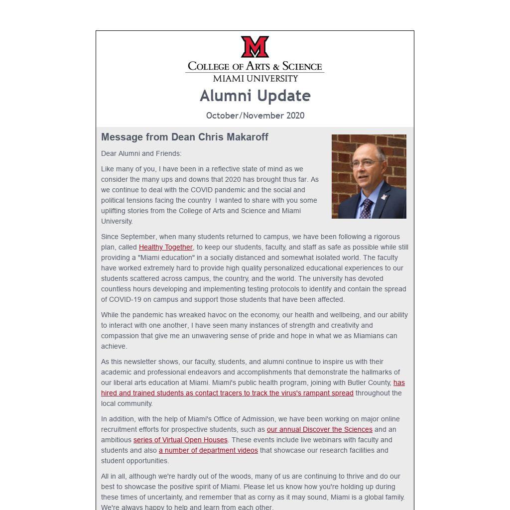 Like many of you, I have been in a reflective state of mind as we consider the many ups and downs that 2020 has brought thus far. As we continue to deal with the COVID pandemic and the social and political tensions facing the country I wanted to share with you some uplifting stories from the College of Arts and Science and Miami University.