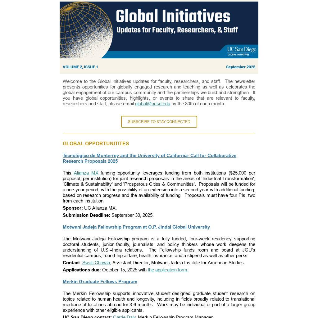 Welcome to the Global Initiatives updates for faculty, researchers, and staff. The newsletter presents opportunities for globally engaged research and teaching as well as celebrates the global engagement of our campus community and the partnerships we build and strengthen. If you have global opportunities, highlights, or events to share that are relevant to faculty, researchers and staff, please email global@ucsd.edu by the 30th of each month.