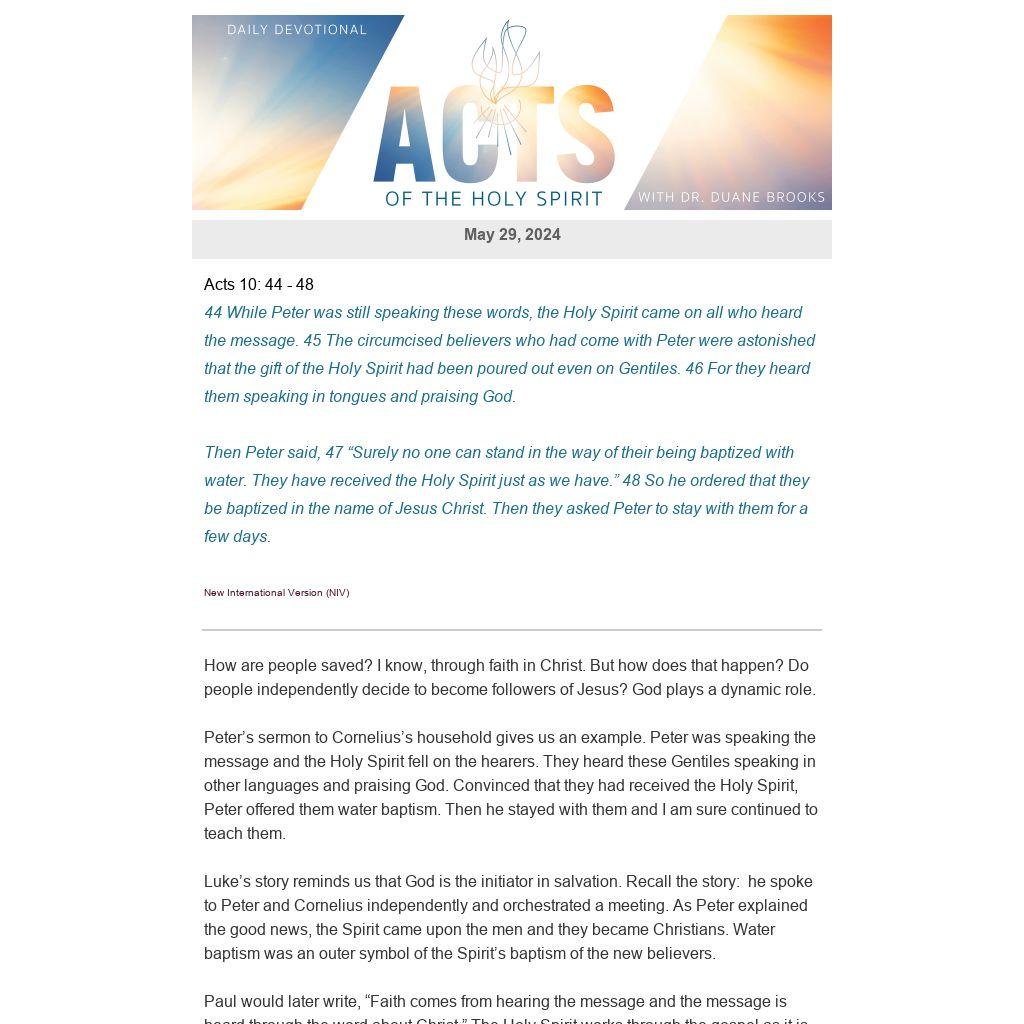 Luke’s story reminds us that God is the initiator in salvation. Recall the story: he spoke to Peter and Cornelius independently and orchestrated a meeting. As Peter explained the good news, the Spirit came upon the men and they became Christians. Water baptism was an outer symbol of the Spirit’s baptism of the new believers.