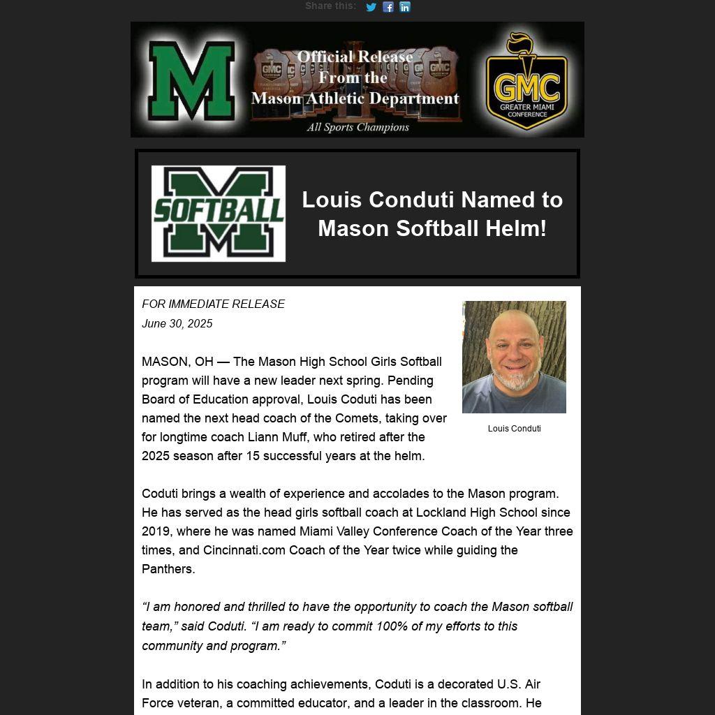 MASON, OH — The Mason High School Girls Softball program will have a new leader next spring. Pending Board of Education approval, Louis Coduti has been named the next head coach of the Comets, taking over for longtime coach Liann Muff, who retired after the 2025 season after 15 successful years at the helm.