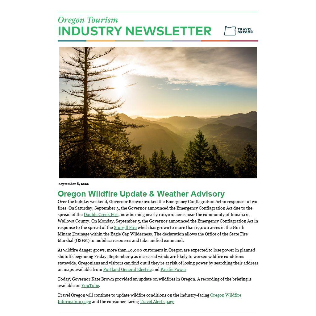 Oregon Wildfire Update & Weather AdvisoryOver the holiday weekend, Governor Brown invoked the Emergency Conflagration Act in response to two fires. On Saturday, September 3, the Governor announced the Emergency Conflagration Act due to the spread of the Double Creek Fire, now burning nearly 100,100 acres near the community of Imnaha in Wallowa County. On Monday, September 5, the Governor announced the Emergency Conflagration Act in response to the spread of the Sturgill Fire which has grown to more than 17,000 acres in the North Minam Drainage within the Eagle Cap Wilderness. The declaration allows the Office of the State Fire Marshal (OSFM) to mobilize resources and take unified command.