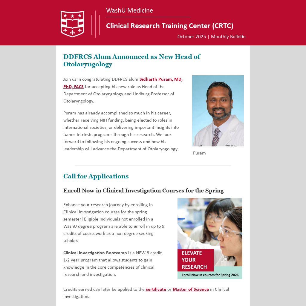 Enhance your research journey by enrolling in Clinical Investigation courses for the spring semester! Eligible individuals not enrolled in a WashU degree program are able to enroll in up to 9 credits of coursework as a non-degree seeking scholar.