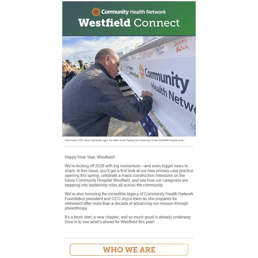 We’re kicking off 2026 with big momentum—and even bigger news to share. In this issue, you’ll get a first look at our new primary care practice opening this spring, celebrate a major construction milestone on the future Community Hospital Westfield, and see how our caregivers are stepping into leadership roles all across the community.