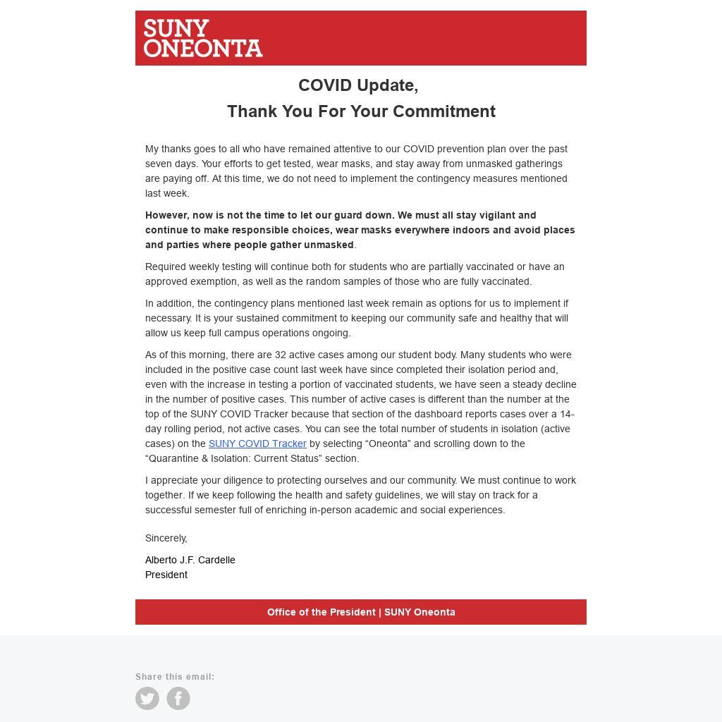 I appreciate your diligence to protecting ourselves and our community. We must continue to work together. If we keep following the health and safety guidelines, we will stay on track for a successful semester full of enriching in-person academic and social experiences.