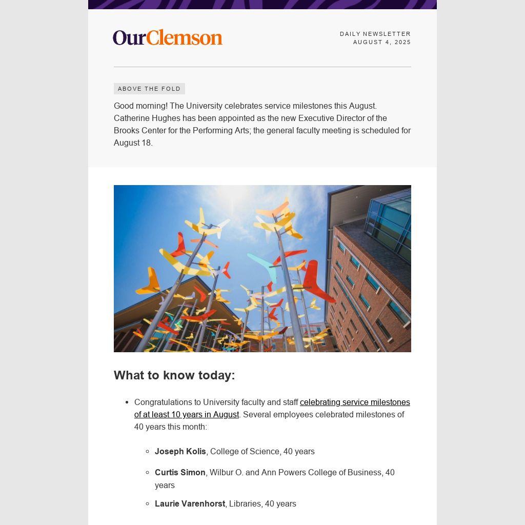 Good morning! The University celebrates service milestones this August. Catherine Hughes has been appointed as the new Executive Director of the Brooks Center for the Performing Arts; the general faculty meeting is scheduled for August 18.