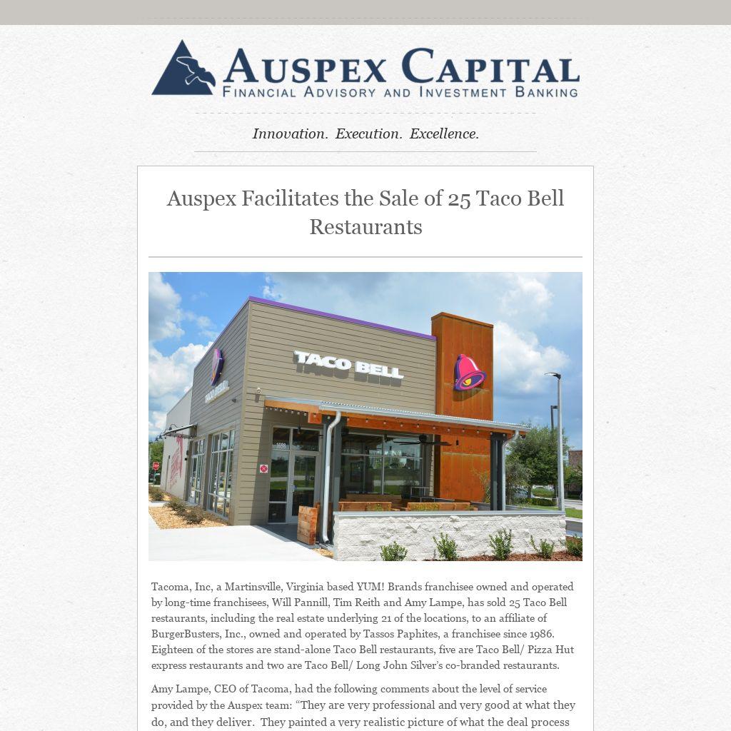 Amy Lampe, CEO of Tacoma, had the following comments about the level of service provided by the Auspex team: “They are very professional and very good at what they do, and they deliver. They painted a very realistic picture of what the deal process was going to be and gave us very good advice throughout the process. They have done so many of these transactions including, sell-side, buy-side and financings, and all that experience brought a wealth of knowledge to our transaction. They under-promise and over-deliver. They became our trusted advisor and that’s what you want when you are doing one of these deals – somebody you know is going to tell you the truth, that you can get hold of and somebody you can count on to give you good advice.”