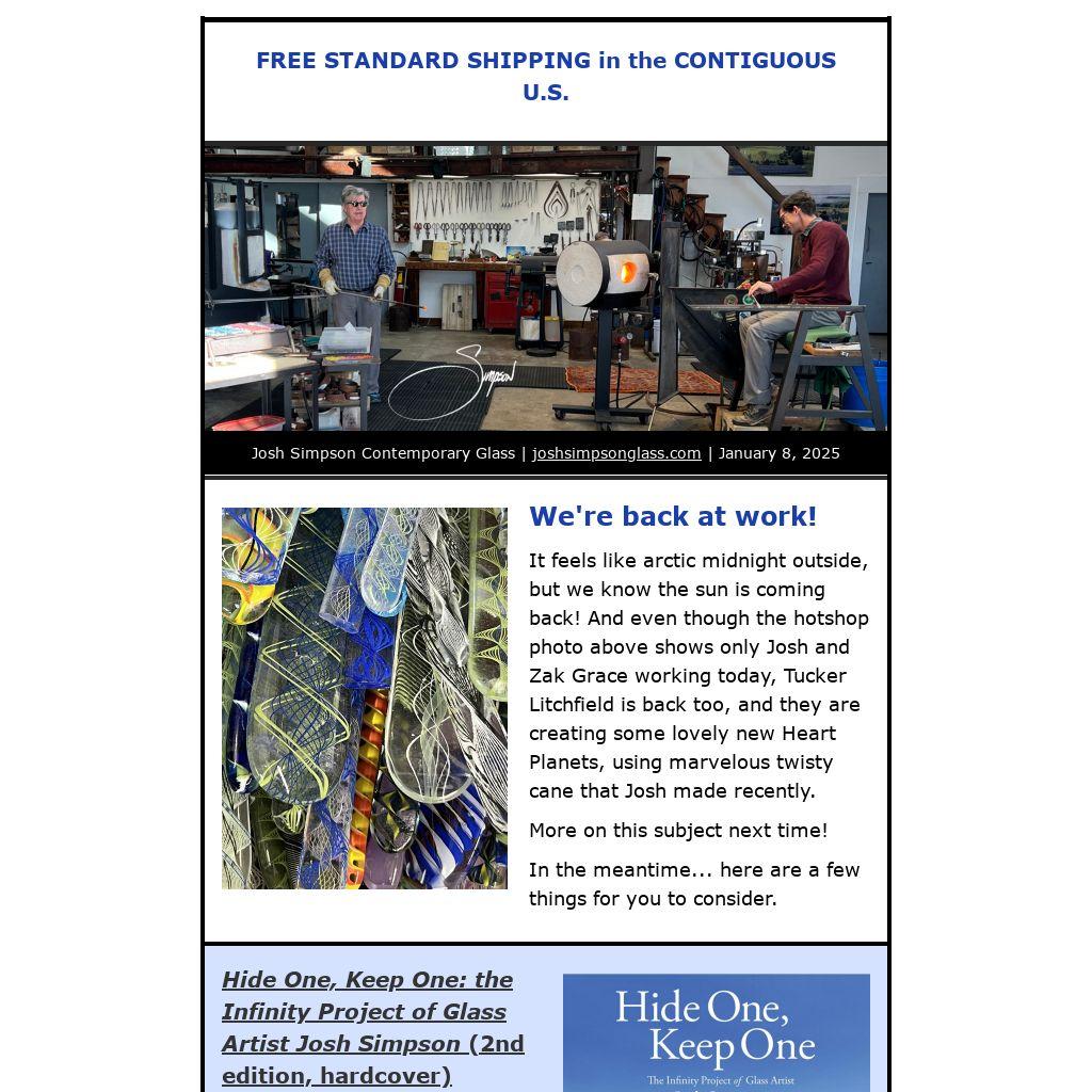 It feels like arctic midnight outside, but we know the sun is coming back! And even though the hotshop photo above shows only Josh and Zak Grace working today, Tucker Litchfield is back too, and they are creating some lovely new Heart Planets, using marvelous twisty cane that Josh made recently.