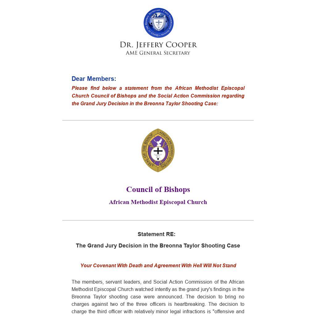 The members, servant leaders, and Social Action Commission of the African Methodist Episcopal Church watched intently as the grand jury's findings in the Breonna Taylor shooting case were announced. The decision to bring no charges against two of the three officers is heartbreaking. The decision to charge the third officer with relatively minor legal infractions is "offensive and outrageous." The justice system of the state of Kentucky has made a covenant with death and an agreement with hell. (Isaiah 28: 15)