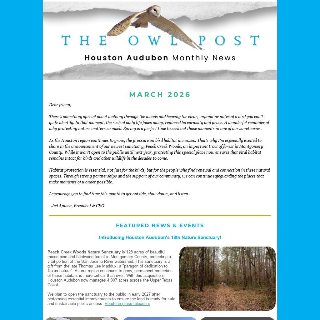 As the Houston region continues to grow, the pressure on bird habitat increases. That’s why I’m especially excited to share in the announcement of our newest sanctuary, Peach Creek Woods, an important tract of forest in Montgomery County. While it won’t open to the public until next year, protecting this special place now ensures that vital habitat remains intact for birds and other wildlife in the decades to come.
