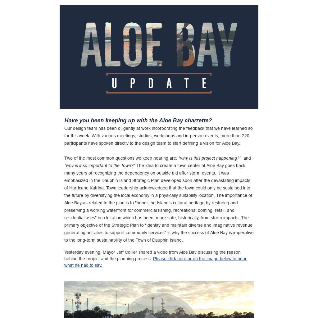 If you have not had the chance to talk with our design team, several opportunities still exist. Below is the remaining schedule for the Aloe Bay Charrette this week, and we hope to talk with you during one of these times. Don't worry though - if you miss something, recordings of all of the virtual meetings will be posted to the project website: www.aloebay.org.