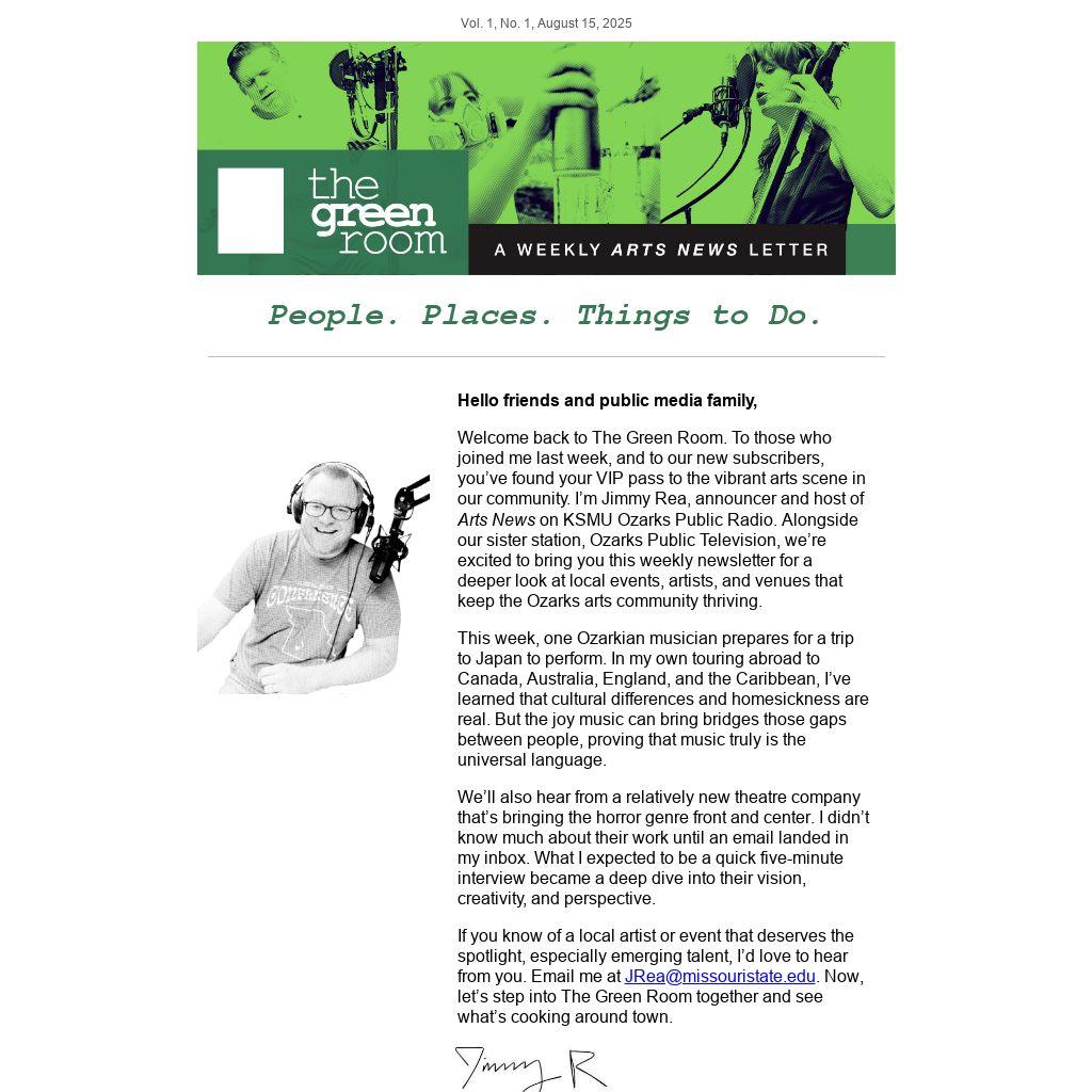 Welcome back to The Green Room. To those who joined me last week, and to our new subscribers, you’ve found your VIP pass to the vibrant arts scene in our community. I’m Jimmy Rea, announcer and host of Arts News on KSMU Ozarks Public Radio. Alongside our sister station, Ozarks Public Television, we’re excited to bring you this weekly newsletter for a deeper look at local events, artists, and venues that keep the Ozarks arts community thriving.