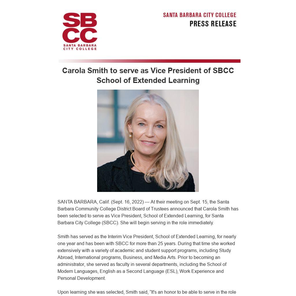SANTA BARBARA, Calif. (Sept. 16, 2022) — At their meeting on Sept. 15, the Santa Barbara Community College District Board of Trustees announced that Carola Smith has been selected to serve as Vice President, School of Extended Learning, for Santa Barbara City College (SBCC). She will begin serving in the role immediately.